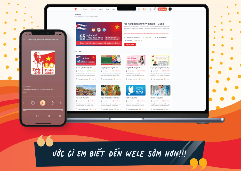 Đã rất nhiều bạn sinh viên chia sẻ với chương trình rằng “Ước gì em biết đến WELE sớm hơn”. Hãy tham gia chương trình sớm nhất có thể, để có thể chấm dứt nỗi sợ nghe tiếng Anh, và rèn luyện thói quen nghe tiếng Anh hàng ngày, như hàng ngàn thành viên khác của WELE!